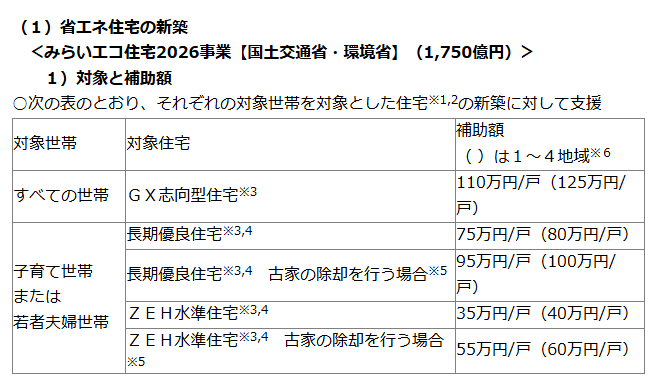 2026年の住宅補助金「みらいエコ住宅2026事業」が発表されました
