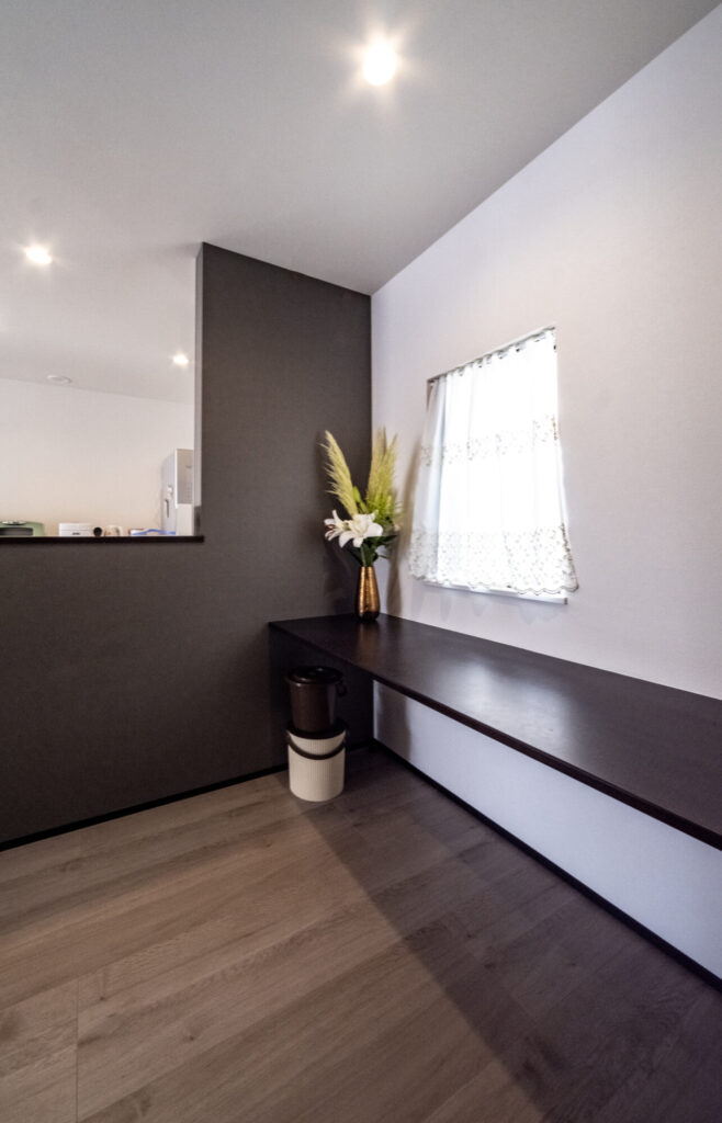 LDKの一角に設けられたカウンタースペースです。パソコンを置いて使うもよし、何かを飾るのもよし。キッチンの目の前なのでお子さま見ながらの勉強スペースとしても活用できます。